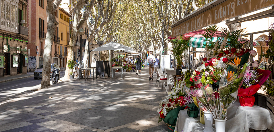 Imagen de Las Ramblas de Palma y sus típicas tiendas de flores.